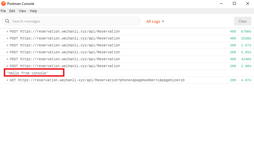 可以看到我们在上面输出的日志已经输出到 postman console 了