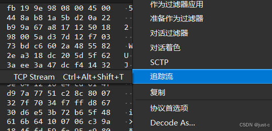 5.在搜到的这一行,右键,点击追踪流,点击TCP流