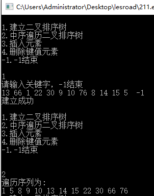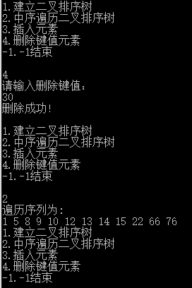 #include <bits/stdc++.h> using namespace std; bool f; struct node { int data; node *l, *r; }; void menu() { puts("\n1.建立二叉排序树"); puts("2.中序遍历二叉排序树"); puts("3.插入元素"); puts("4.删除键值元素"); puts("-1.-1结束\n"); } void add(node *&BT, int x) { if(!BT) { BT = (node *)malloc(sizeof(node)); BT->data = x; BT->l = BT->r = NULL; } else if(BT->data > x) add(BT->l, x); else if(BT->data < x) add(BT->r, x); else f = 1; } void create(node *&BT) { int x; while(1) { cin>>x; if(x == -1) return; add(BT, x); } } void visit(node *BT) { if(BT) { visit(BT->l); printf("%d ", BT->data); visit(BT->r); } } void Delete(node *&BT, int x) { node *t; if(!BT) { puts("未找到此元素"); f = 1; } else if(BT->data < x) Delete(BT->r, x); else if(BT->data > x) Delete(BT->l, x); else { if(!BT->l && !BT->r) //无左右孩子 { free(BT); BT = NULL; } else if(!BT->l && BT->r) //仅有右孩子 { free(BT); BT = BT->r; } else if(BT->l && !BT->r) //仅有左孩子 { free(BT); BT = BT->l; } else //左右都有 { t = BT->r; while(t->l) t = t->l; BT->data = t->data; Delete(BT->r, t->data); } } } int main() { int x, n; node *BT = NULL; while(1) { menu(); cin>>x; if(x == -1) break; switch(x) { case 1: puts("请输入关键字,-1结束"); create(BT); puts("建立成功"); break; case 2: puts("遍历序列为:"); visit(BT); break; case 3: puts("请输入插入关键字"); f = 0; cin>>n; add(BT, n); if(f) puts("存在重复键值!"); else puts("插入成功!"); break; case 4: puts("请输入删除键值:"); cin>>n; f = 0; Delete(BT, n); if(!f) puts("删除成功!"); break; default: puts("输入错误!"); } } return 0; }