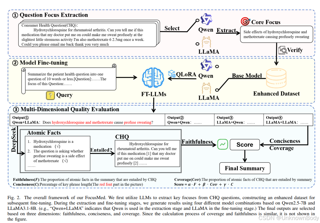文章针对在线医疗平台中消费者健康问题(CHQs)存在冗余信息多、专业术语少,导致医生诊断效率低的问题,聚焦医疗问题摘要(MQS)任务展开研究。该任务旨在将CHQs转化为简洁的医生常用问题(FAQs),但现有方法存在问题焦点识别差、模型幻觉等挑战。