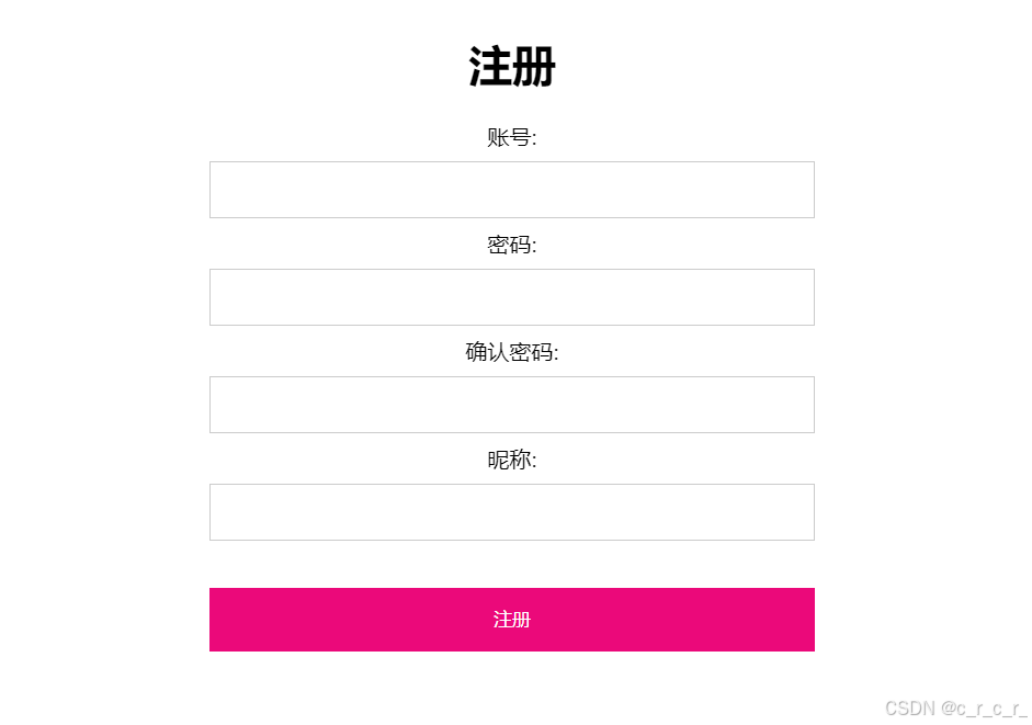 - 注册页面中,输入账号、密码、确认密码、昵称,点击注册,注册后自动跳转到登录页面