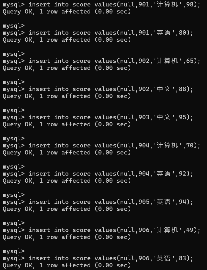 向score表插入记录如下;
