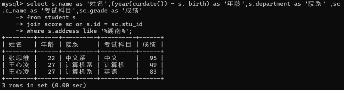 15.查询都是湖南的学生的姓名、年龄、院系和考试科目及成绩