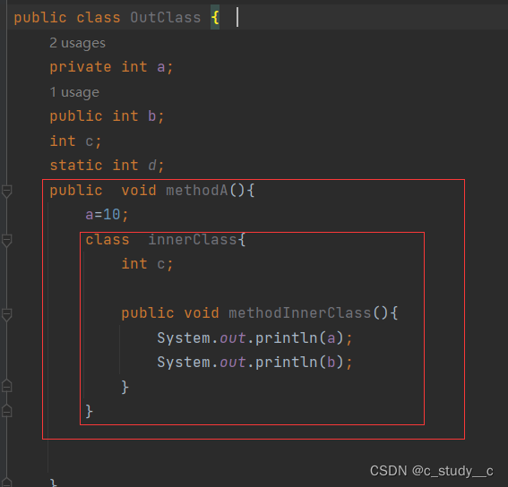 局部类,在外部类的方法中又定义一个类,最小的红色方框是局部内部类