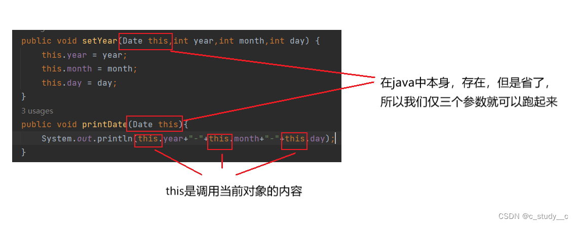 this引用指向当前对象(成员方法运行时调用该成员方法的对象),在成员方法中所有成员变量的操作,都是通过该引用去访问