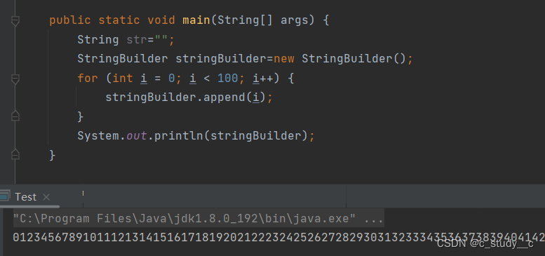 (append方法是拼接的意思)这里我们稍微改动一下,就是把创建StringBuilder对象放在for循环的前面,每次有了就不用在新创建对象了,加快了运行速度(这些数字都不大,可以尝试大一点的数字就可以看出区别了)