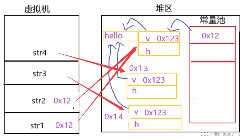 分析一下这个图,0x12是表示是str1的地址,放在常量池中,当str2也是直接赋值字符串时,就会直接在常量池中找有没有0x12这个地址了,有的话就指向了该地址,所以str2==str1为真,str3与