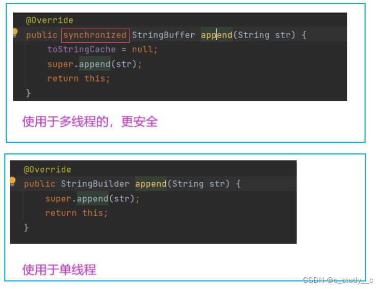 觉得这些有什么不同的地方呢,其实不同就在于StringBuffer中有一个synchronize的出现,能够为多线程有一个哨卡作用没更加安全