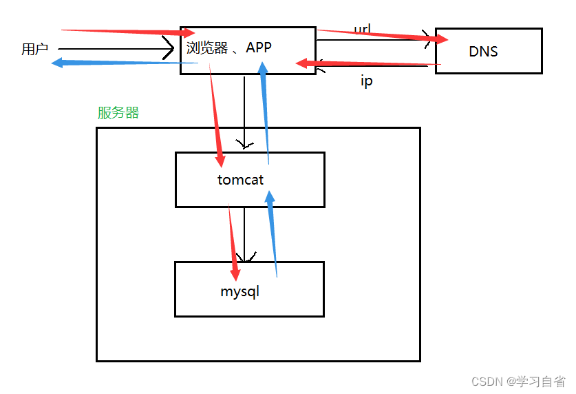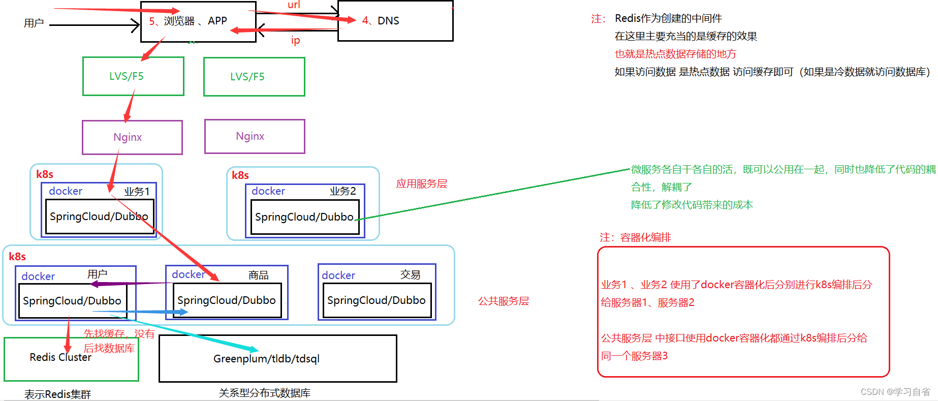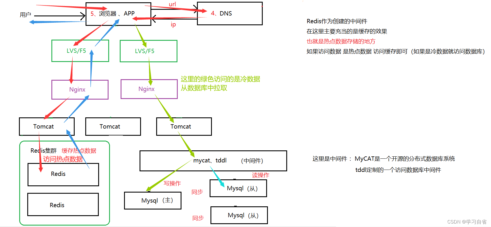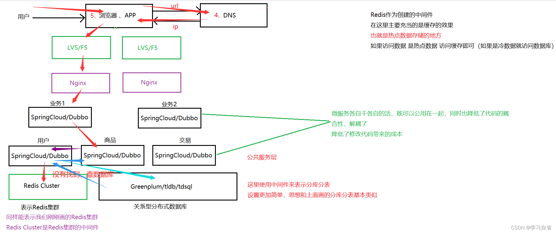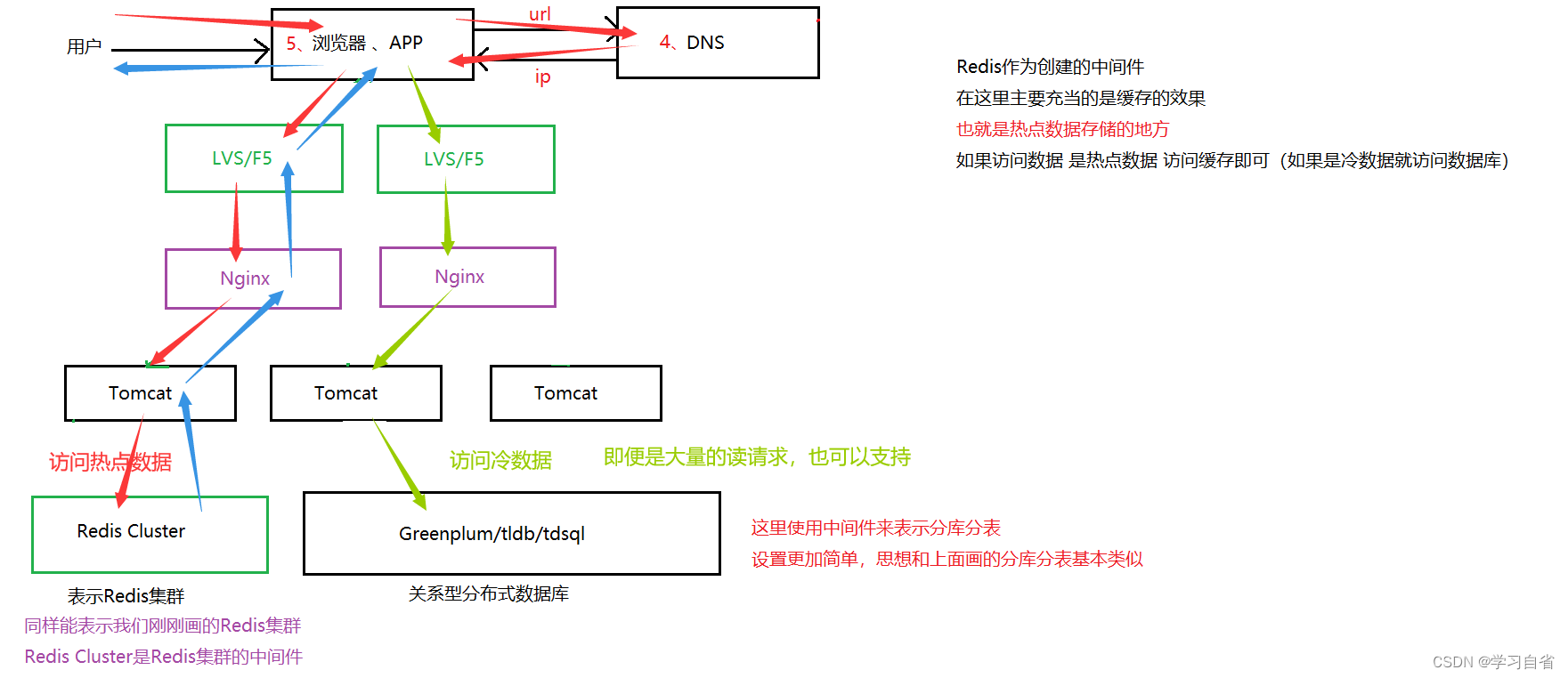 红色箭头表示请求,蓝色箭头表示响应,紫色箭头表示去拿用户信息,浅蓝色箭头表示缓存没有,访问数据库