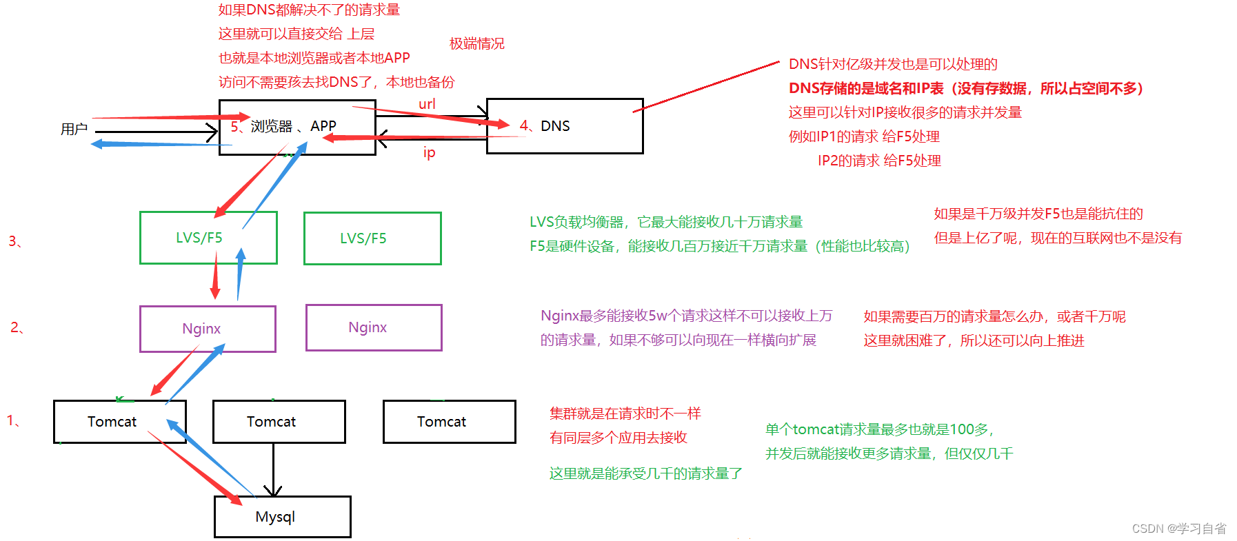 注:根据需求而定不是说这样的架构一定好,能承载越多并发量就越适合当前,根据情况而定;对于图解有个解释,上面画的只是一个大概的图,实际上有了上层之后,下层就需要更多来接收,毕竟上层是负载均衡器,还是要给下层分配的