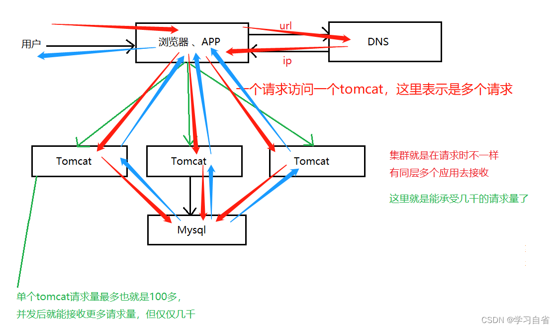 注:能接收请求量多到数千,多个应用服务器集群同时处理大量请求量(此处tomcat就是横向扩展)