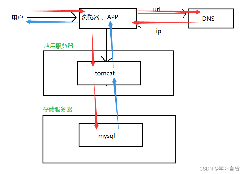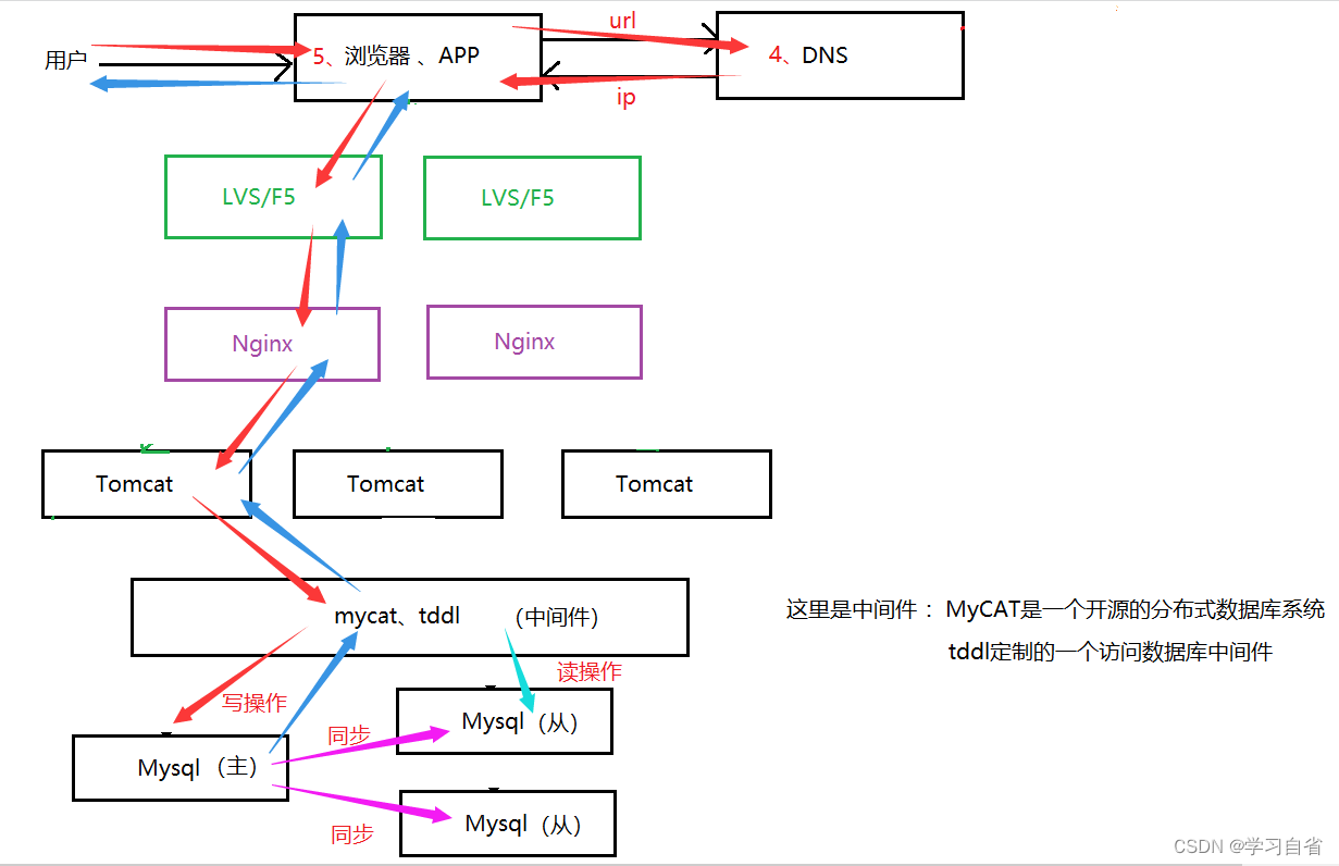 注:红色箭头表示请求是写操作;浅蓝色箭头表示读操作;紫色箭头表示写操作进行同步,同步给从库;蓝色箭头表示响应