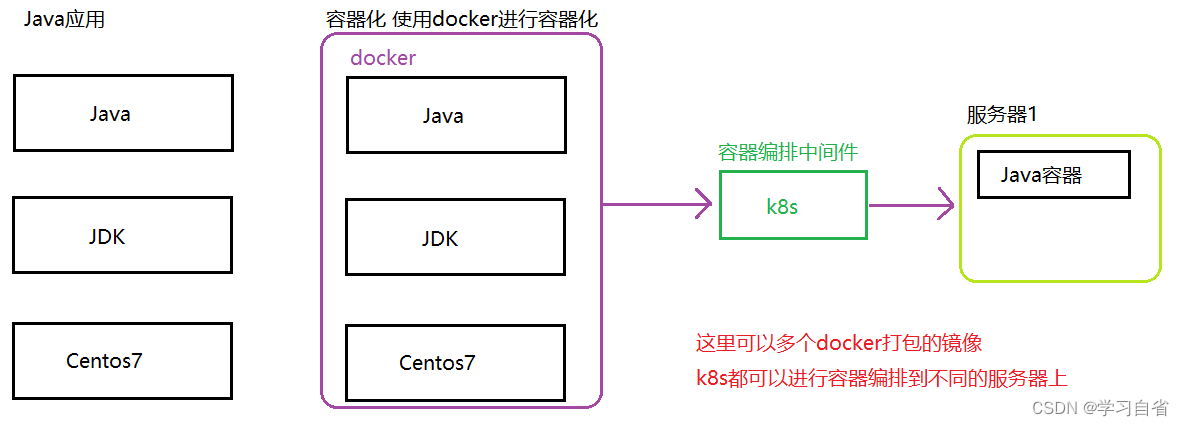 这里就我们比较熟悉的Java一套体系来说 java应用涉及:java、jdk、centos7 但是我们放到服务器上一次一次放太麻烦了,docker可以直接打包这个三个体系称为一个体系,直接部署到服务器上