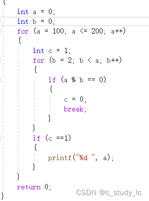 所以我在这里引入了一个c来代表真假,a % b == 0则c=0即这个数不是素数,这样if(c==1)时这个数是素数,就可以打印了