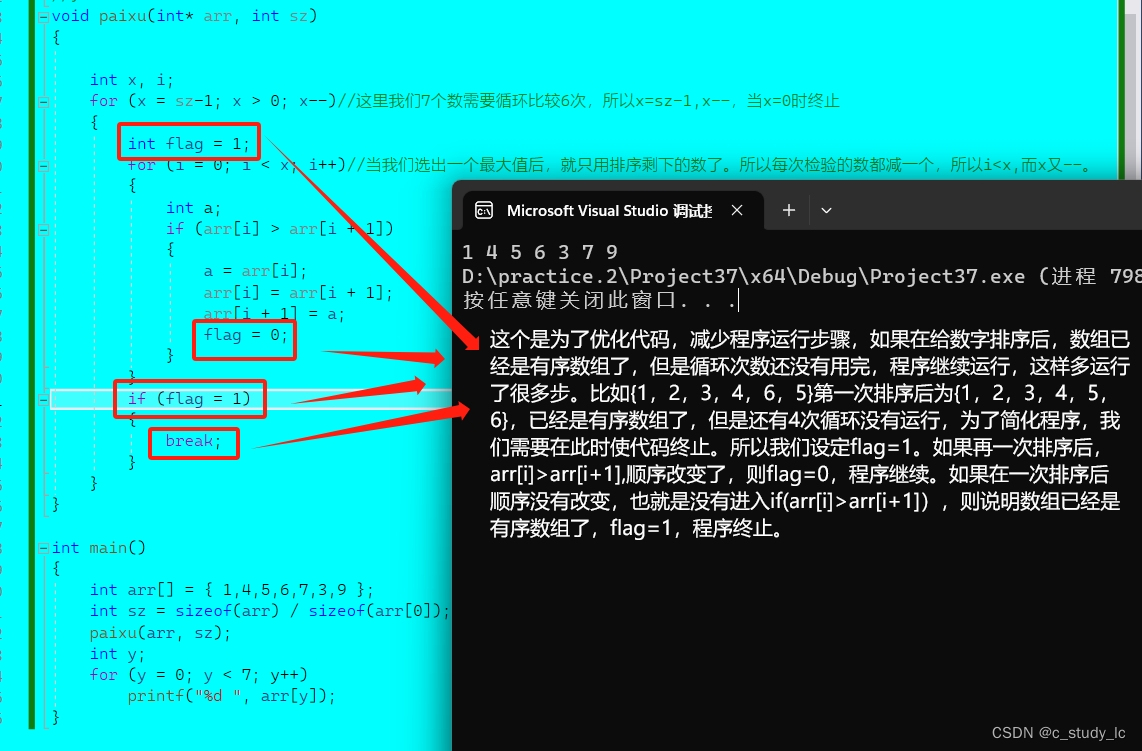 假设一个数组有x个元素,则需要排x-1次,每次选出一个最大值,然后继续挑出除了上一次最大值剩下的值中的最大值。如arr [ ]={1,4,5,7,3},第一次挑出了7,为arr [ ]={1,4,5,3,7}。第二次挑出5,为arr [ ]={1,4,3,5,7}。第三次挑出4,为arr [ ]={1,3,4,5,7}…最后,我们数组就从左到右以小到大的顺序排列了。代码如下(优化后)