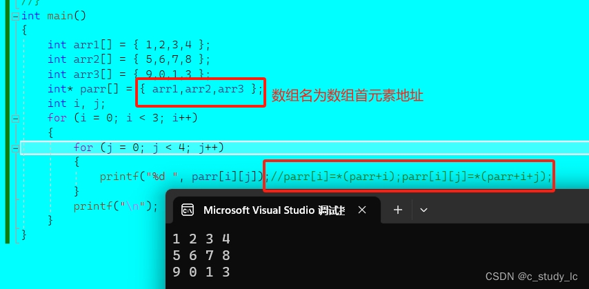 parr[i]是访问parr数组的元素,parr[i]找到的数组元素指向了整型⼀维数组,parr[i][j]就是整型⼀维数 组中的元素。 上述的代码模拟出⼆维数组的效果,实际上并⾮完全是⼆维数组,因为每⼀⾏并⾮是连续的。
