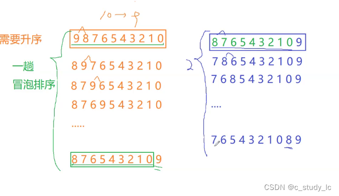 核心思想:两两相邻的数字进行比较。比如一个数组arr [ ]={1,4,5,7,3};一次冒泡排序后变为{1,4,5,3,7}。就像下面这个例子一样