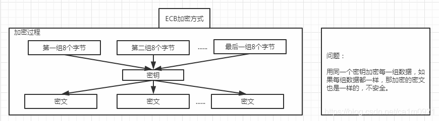 ECB加密方式 对每一个明文分组独立处理,所以明文若8个字节一组相同的话,加密出来的结果也是8个字节一组是相同的。