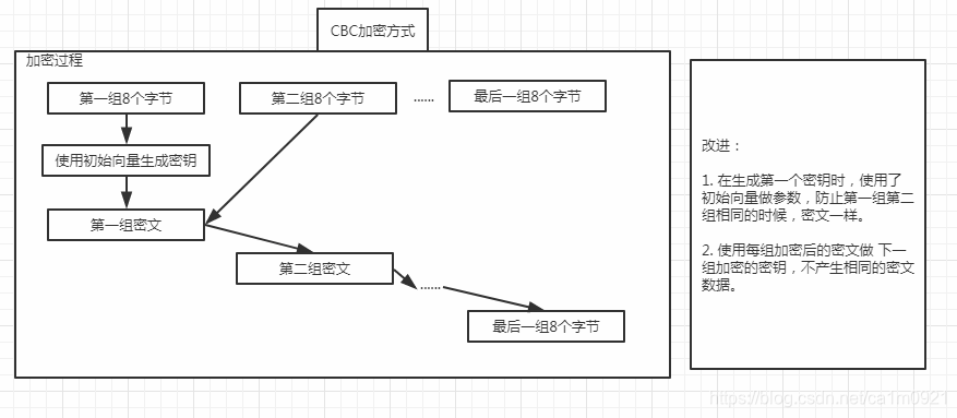 如此一来,每次即使之后的每组字节相同,也会因为 密钥的不同,而产生不同的密文。剩下的问题就是,如果待加密数据的前两组数据相同,那还是有可能产生两组相同的密文的。为此,CBC使用一个8个字节的随机数来加密第一个分组,其作用类似于口令中的盐。