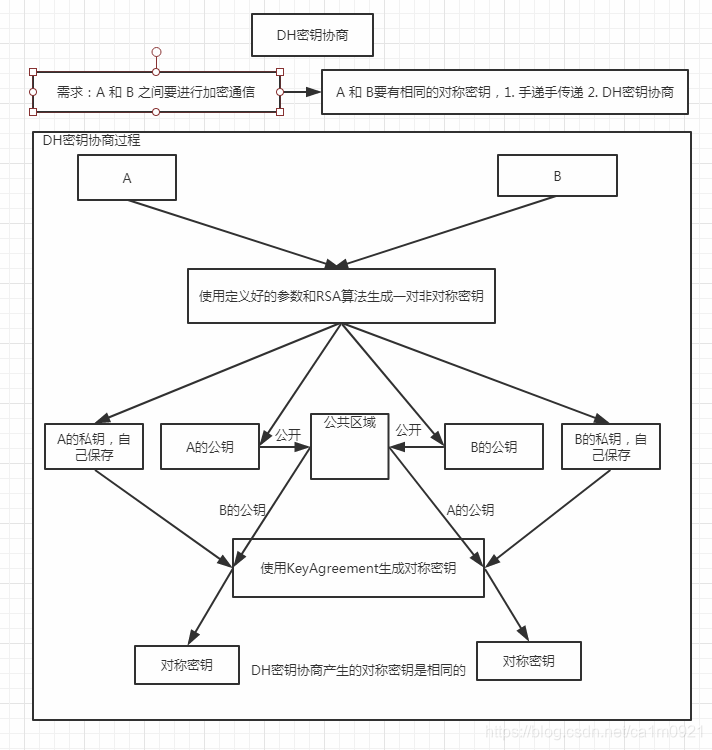 然后,各自使用自己的私钥和对方的公钥,经过 KeyAgreement 方法生成一个对称密钥,