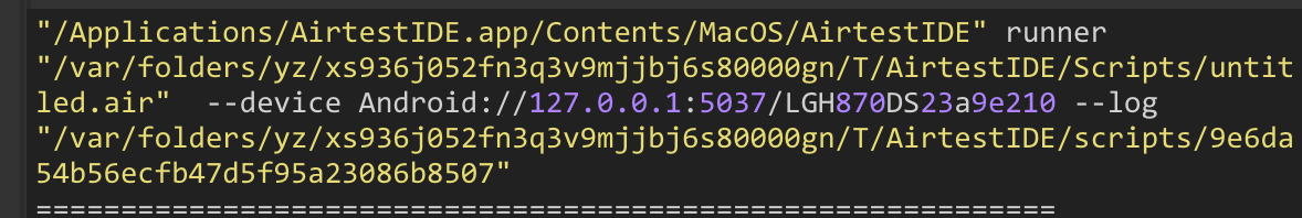"/Applications/AirtestIDE.app/Contents/MacOS/AirtestIDE" runner "/var/folders/yz/xs936j052fn3q3v9mjjbj6s80000gn/T/AirtestIDE/Scripts/untitled.air" --device Android://127.0.0.1:5037/LGH870DS23a9e210 --log "/var/folders/yz/xs936j052fn3q3v9mjjbj6s80000gn/T/AirtestIDE/scripts/9e6da54b56ecfb47d5f95a23086b8507"