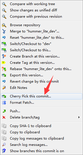 - 比如,我们现在在dev上修复了一个基础功能的bug,并且已经push到远程了。这时,我们想把这次commit合并到hummer_lite_dev这个分支上。