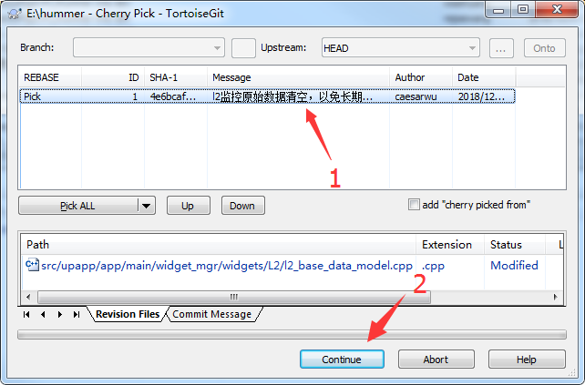 - 这时就会弹出cherry pick的界面,选中需要pick的那次commit,点击contimue,就会把这次commit合并并且提交到到本地的hummer_lite_dev分支上了。这里也可以查看commit的文件和msg,如果有冲突也要解决冲突。