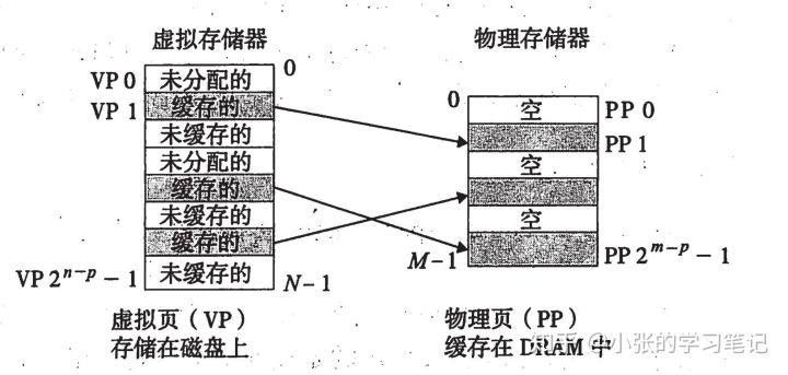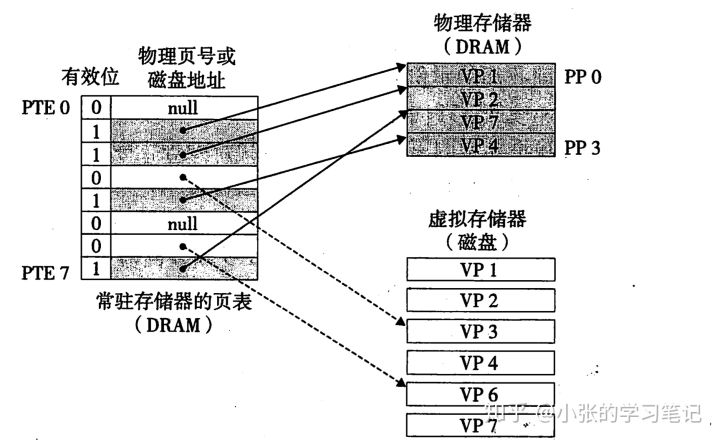 这个示例展示了一个有8个虚拟页的小虚拟存储器,虚拟页0和3还没有被分配,因此在磁盘上还不存在。虚拟页1、4和6被缓存在物理存储器中。页2、5和7已经被分配了,但是当前并未缓存在主存中