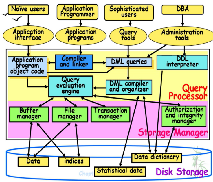 存储管理器storage manager提供数据库的数据和应用程序之间的接口,将各种DML查询操作翻译为底层的文件系统命令。