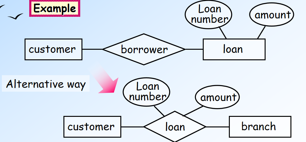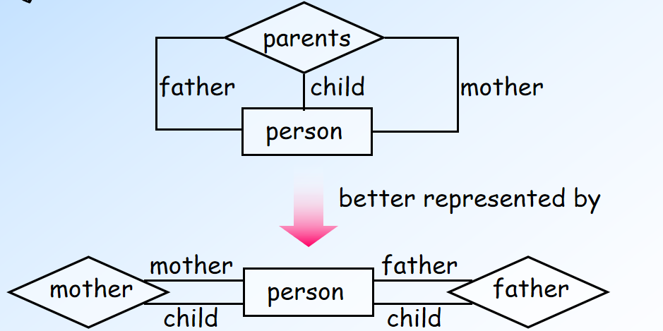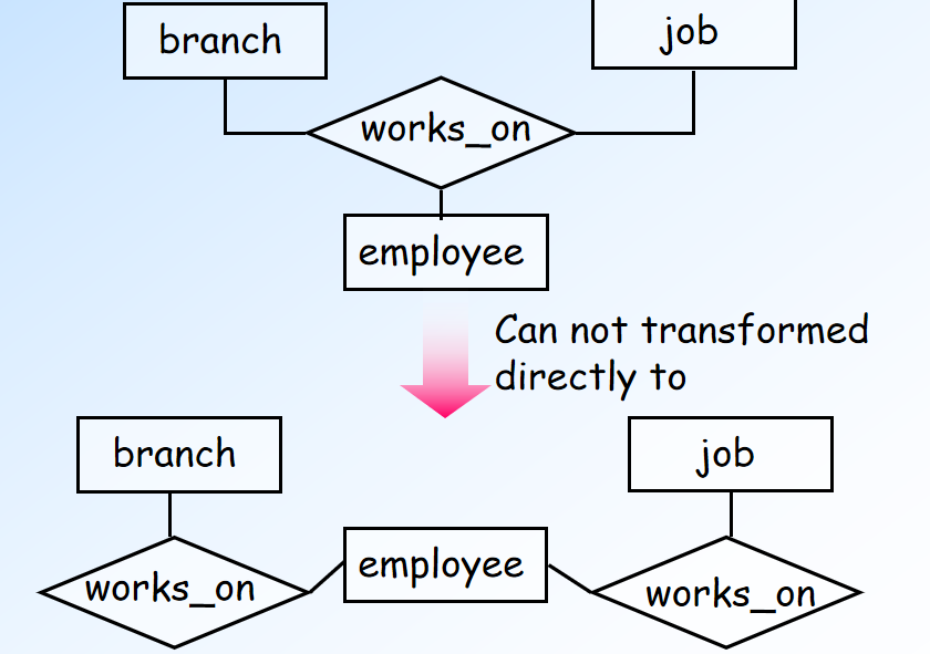 缺点:需要为E创建标识符,n元关系集可能展示的更清晰,三元关系的约束不一定能转换成二元关系的约束。