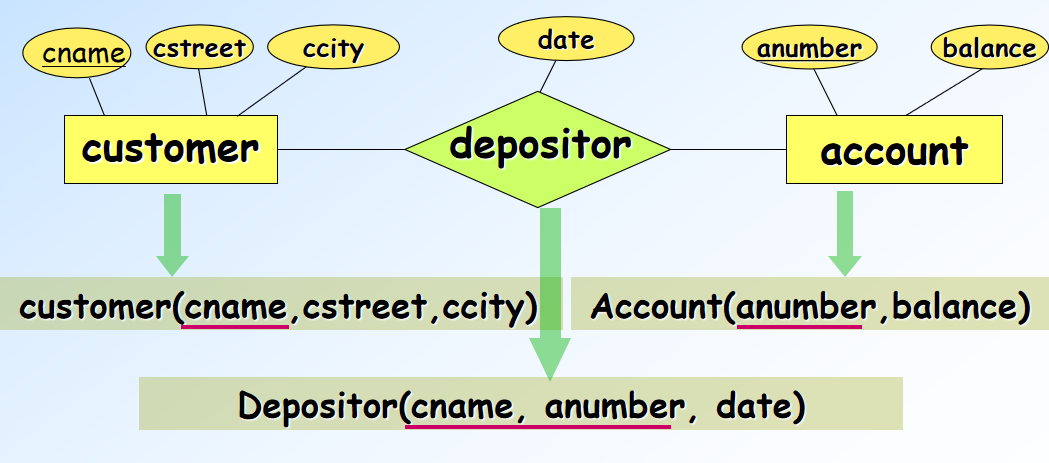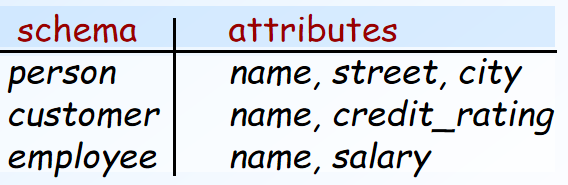 每个实体集和关系集都有唯一的指定名称的模式,每个模式都有许多列(有唯一列名)