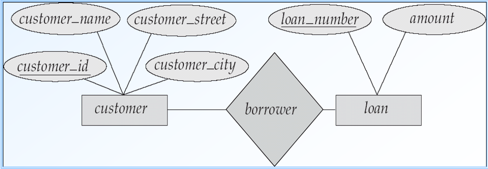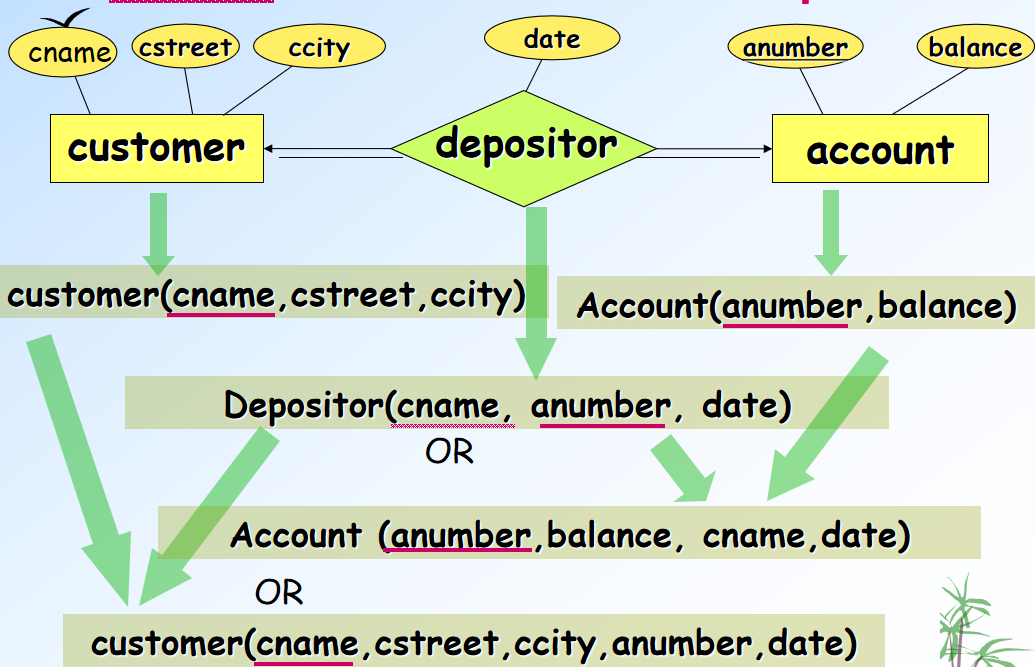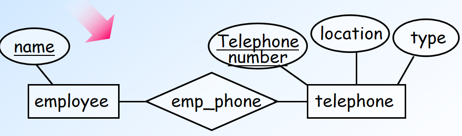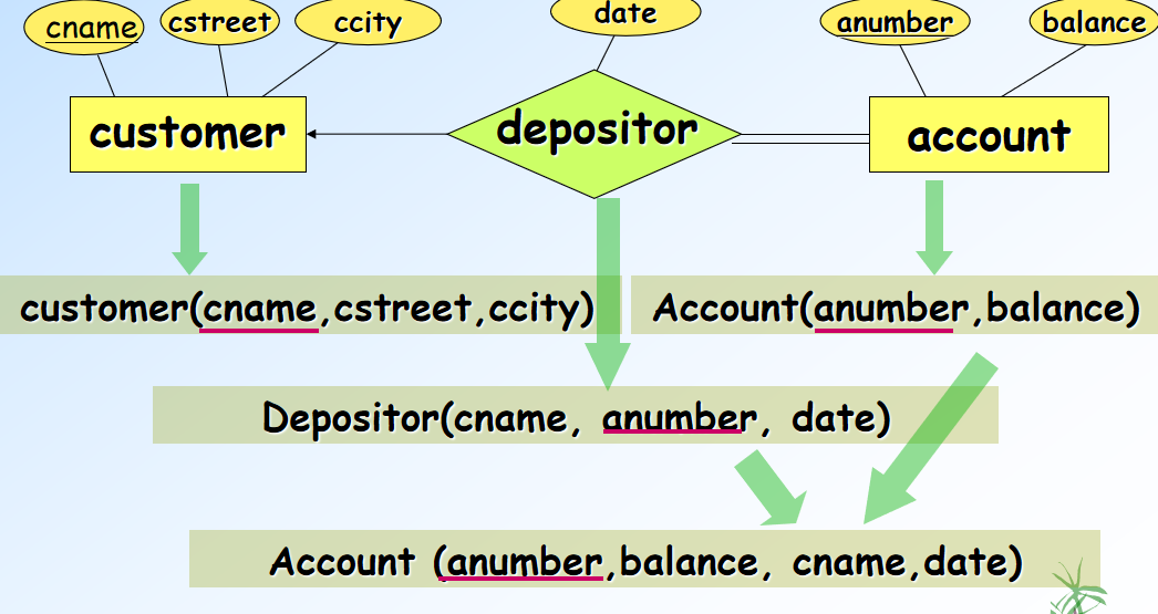 多对多关系表示为两个实体集的主码的属性以及关系集描述性属性。