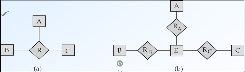 三元转换成二元:创建集合E,放置特殊标识符,将R的属性交给E,对R中每一个关系(a,b,c),创建E中一个新实体ei,把(ei,a)、(ei,b)、(ei,c)添加到Ra,Rb,Rc中