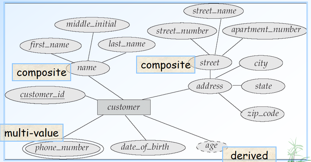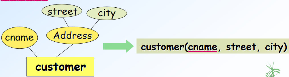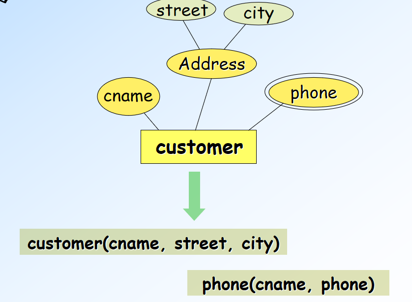 实体E的多值属性M通过单独模式EM表示。EM具有E的主码和M的属性。多值属性的每个值映射到EM上关系的独立元组。