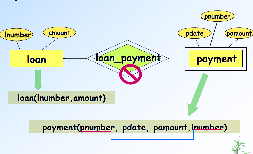 强实体集减少为相同属性的模式,弱实体集变成一个包含强实体集主码的列的表