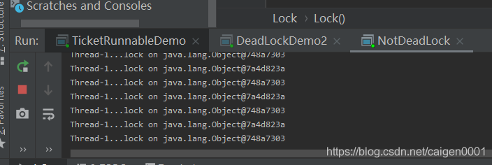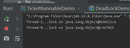 在实现Runnable类中定义两个不同的锁,注意两个线程任务不同,所以这两个锁并不是默认静态锁。