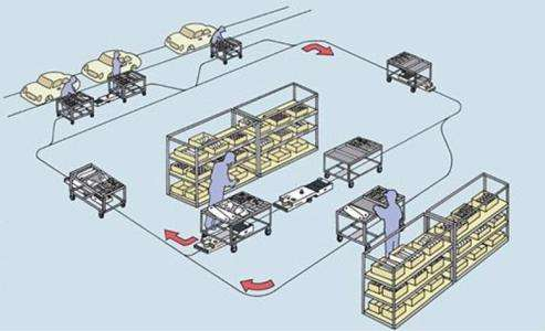 送料, 在仓库的备料位置,每个仓库有空台车下料位和满台车上料位,把产线上的空台车放下,拉着满物料的台车去产线