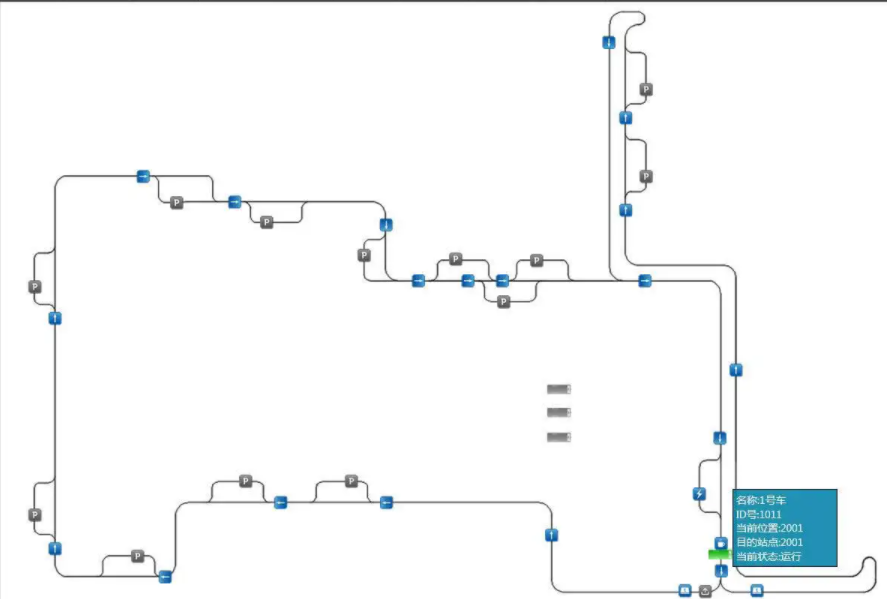 然后根据AGV返回的位置信息上可以看到可以看到AGV当前位置,当前状态(是否有障碍物,是否脱轨,当前是否携带物料等等)。