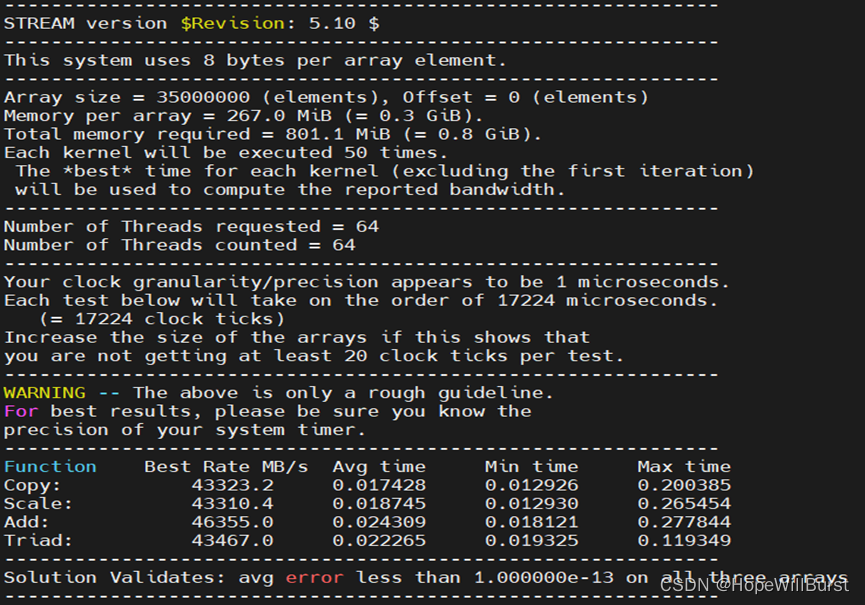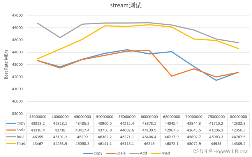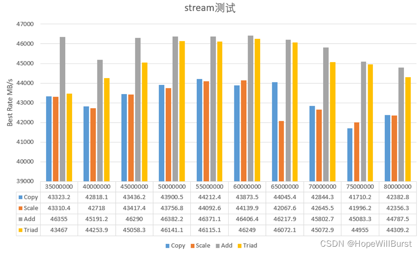 Stream测试得到的是可持续性运行的内存带宽最大值,主要是使用四种数组运算,数组的复制(Copy)、数组的尺度变换(Scale)、数组的矢量求和(ADD)、数组的复合适量求和(Triad)测试内存带宽性能。数组的值采用双精度。