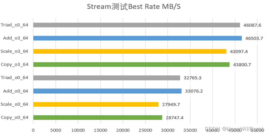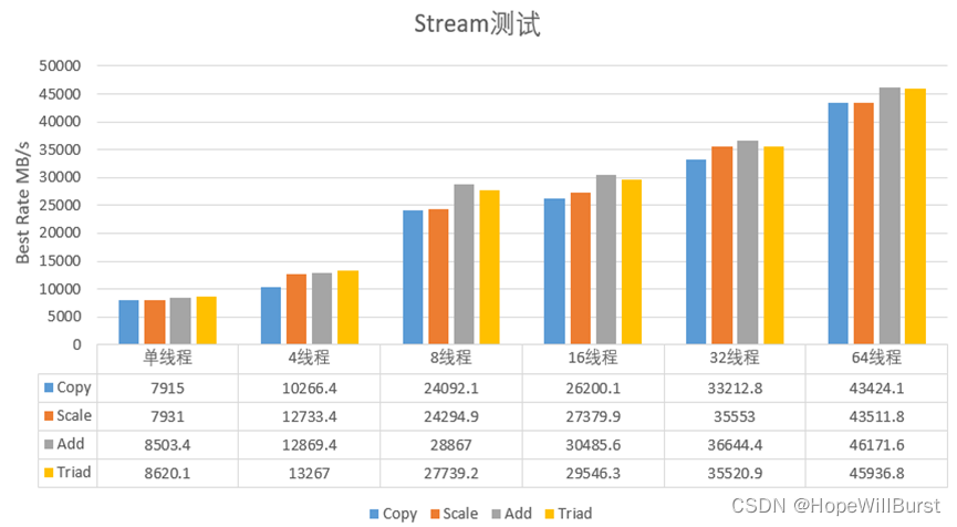 测试的一般规律是Add>Triad>Copy>Scale。因为一次Add和Triad操作都需要三次访问内存,Copy和Scale操作需要进行两次访问内存,访问内存次数越多越能够掩盖访存延迟,带宽越大。