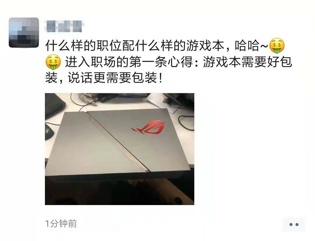 就这样,大学室友森哥,从入职第一天起,就比我高一职级。更吐血的是,入职的第二个月一发工资,他就去买了一个2万块的游戏本!还发了这样一条朋友圈: