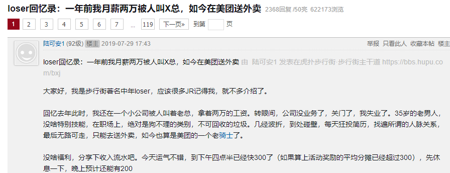 前段时间,虎扑上有一个热帖:《一年前我月薪两万被人叫X总,如今在美团送外卖》。