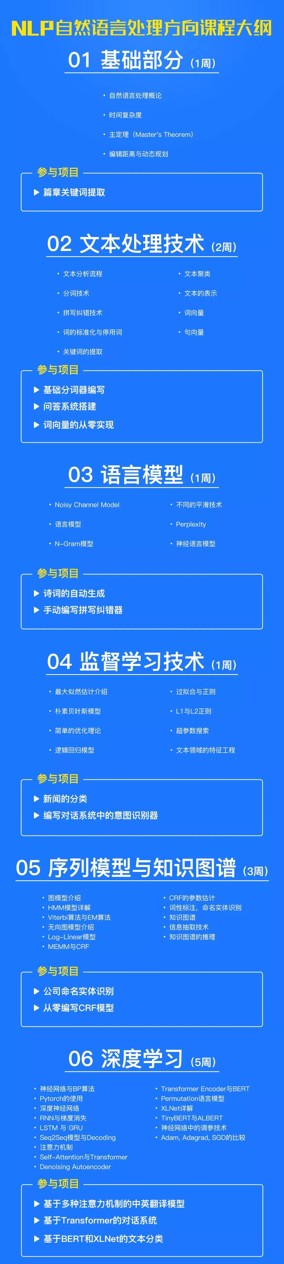 爬虫,文本数据清洗、预处理,文本挖掘,文本分类,知识图谱的构建以及查询, 序列到序列模型,attention机制,模型部署。