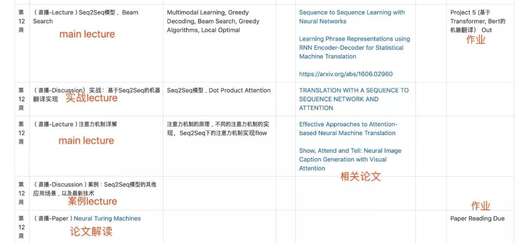课程采用直播教学的方式,一周4次教学安排, 包括1次的专业课程, 1次的公工课程,1次的项目案例讲解 (讲解某一个实战、案例或者技术上的延伸), 1次的paper reading session (辅导及讲解一篇必备论文)。教学模式参考美国顶级院校的教学培养体系。 以下为其中一周的课程安排,供参考。
