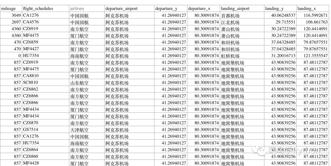 数据解释:数据包含“航班里程、航班名称、航空公司、出发机场、出机场纬度、出发机场经度、着陆机场、着陆机场纬度、着陆机场经度”共9列,15074行数据。