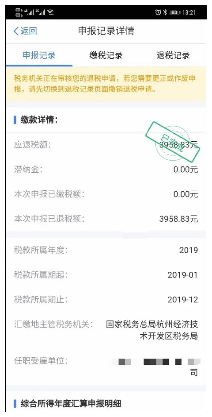 比如邵先生上半年月工资超过20000元,下半年换了单位,月工资降到五六千元,汇算结果可以退税近4000元。