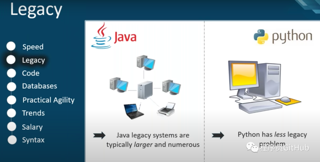 对于legacy代码的支持,由于Java大量的用于电商,互联网后端,银行等大型系统,所以对于legacy的代码的数量要远大于Python。而Python要更轻量级一些,没有那么多legacy的问题。尤其是Py3即将全面推广,Py2要退出历史舞台。