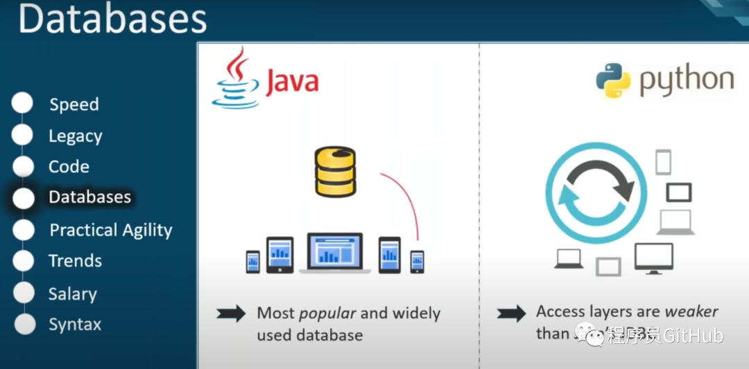 Java跟数据库结合更紧密一些,有大量的数据库支持Java,类似JDBC这样的封装,使得的Java使用数据库更容易。