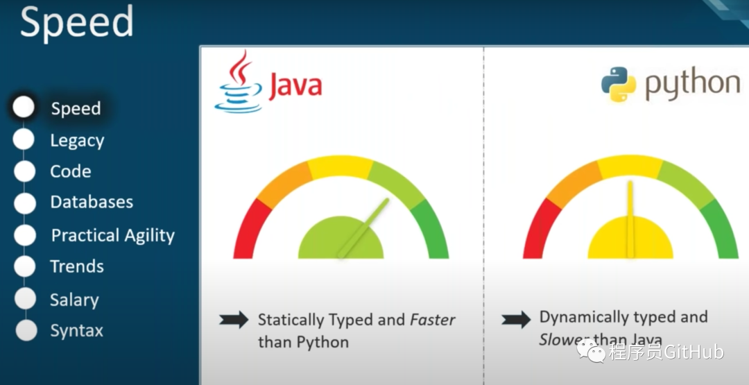 Java是静态语言静态编译的,速度上要比Python快的很多,而Python动态类型语言,一边执行一边编译,速度要上慢一些。