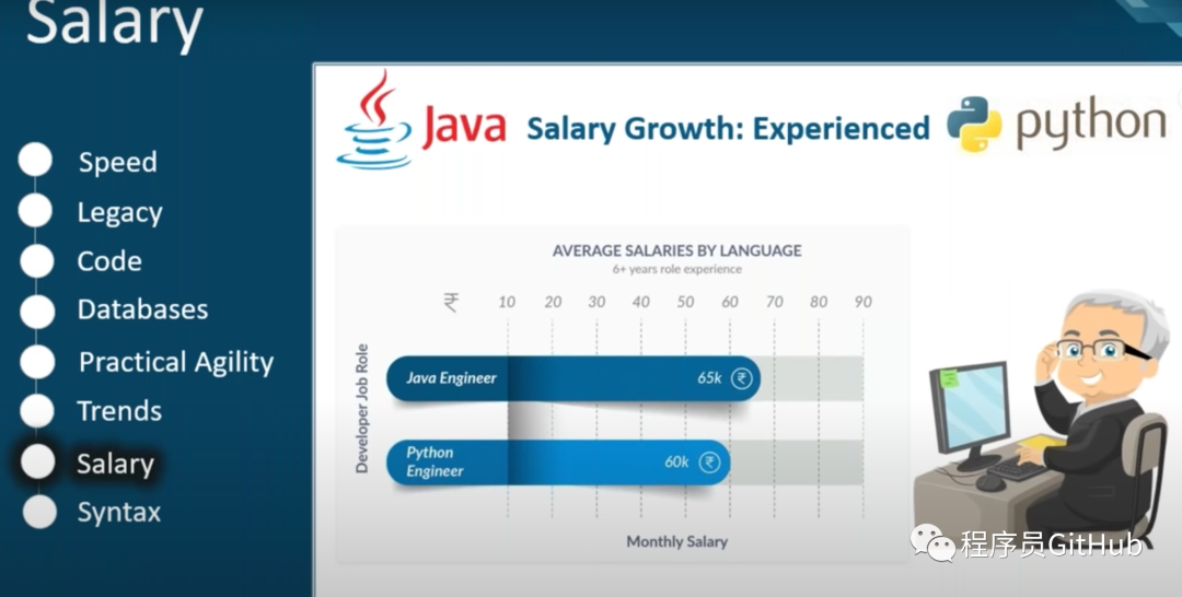 月薪收入Python略胜一筹,主要是因为人工智能太火了,起步价都在30k左右,所以应届生的薪资要高于Java。但是对于资深工程师来说,就不一定喽,看下面的图: